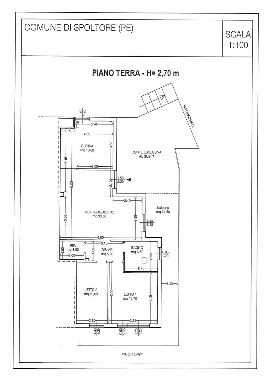 appartamento al piano terra di un edificio plurifamiliare costituito da tre piani fuori terra oltre a copertura – lastrico solare composto da ingresso su cui si apre un ampio vano destinato a soggiorno e cucina, n bagno, un rispoglio e n. 2 camere da letto, oltre balcone di mq. 31,50 che arriva fino all’ingresso della proprietà, disimpegnata da una piccola corte esterna della superficie di circa mq 36,00.