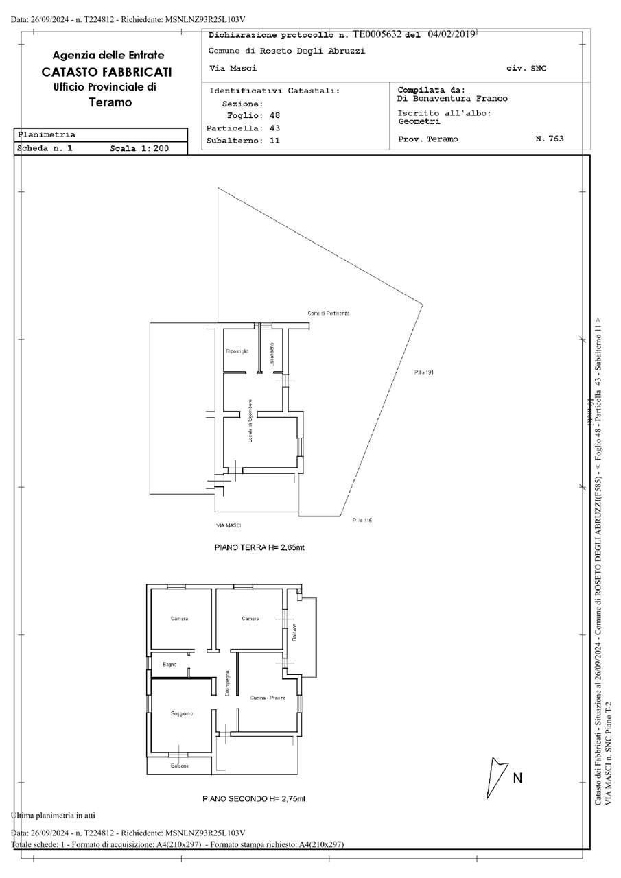 Diritti pari ad 1/1 di piena proprietà su appartamento con annesse pertinenze ubicato nel comune di Roseto degli Abruzzi (Te) in via Masci n.8. Il compendio immobiliare si sviluppa al piano terra e secondo di un fabbricato condominiale di maggiore consistenza a destinazione residenziale. L'appartamento, al piano secondo, si articola internamente in un ingresso su disimpegno, soggiorno, cucina-pranzo, due camere e due bagni, oltre alla presenza di una loggia e due balconi a livello, uno con accesso dal soggiorno e l’altro avente accesso dalla cucina-pranzo e da una delle due camere. Sono annessi all’appartamento dei locali di sgombero al piano terra, oltre ad un corte esterna di pertinenza esclusiva