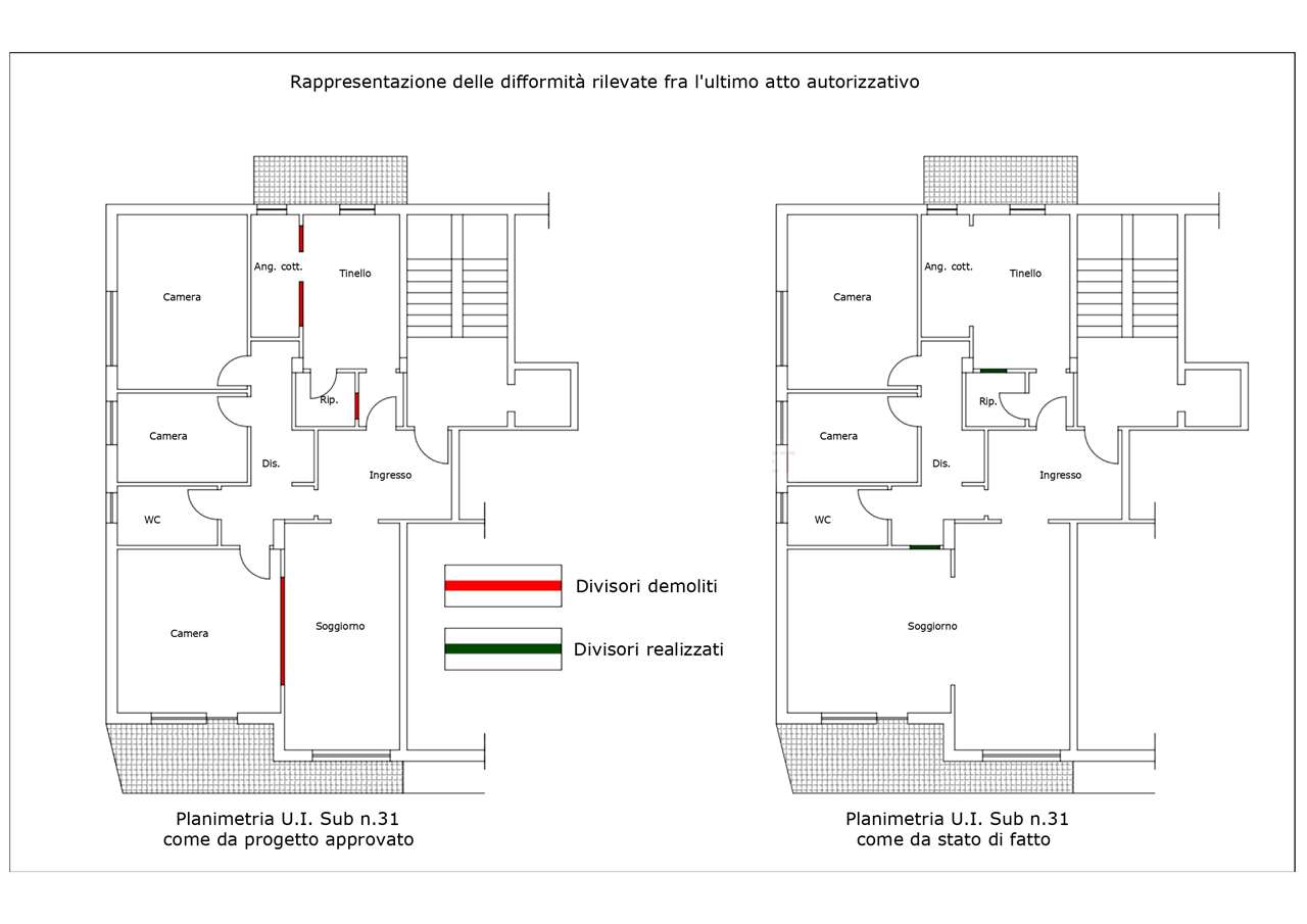 L'immobile non risulta regolare per difformità edilizie. La difformità consiste in una differente distribuzione degli ambienti interni, quali l'ampliamento della zona giorno (soggiorno comunicante con la stanza adiacente), la modifica della posizione della porta del ripostiglio e l'ampliamento dell'apertura tra angolo cottura e tinello. La vigente normativa urbanistica prevede la possibilità di regolarizzare tali difformità