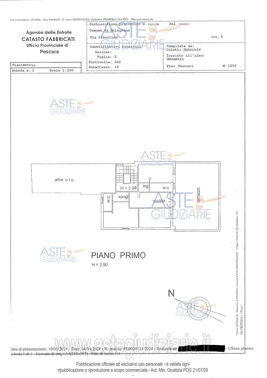 in bolognano (pe), località piano d’orta, via tiburtina n. 5, diritti di piena proprietà su appartamento (mq. 98) al primo piano, composto da ingresso, cucina, tre camere di cui una con spogliatoio, due bagni, oltre ampio terrazzo (mq. 80) accessibile dal vano cucina e da due camere.