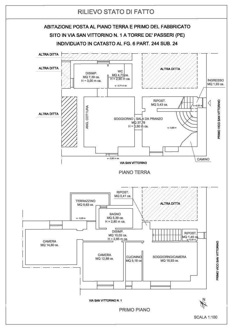 Appartamento composto al pianoterra da ingresso con scala di accesso al piano superiore, soggiorno – cucina, ripostiglio sottoscala, disimpegno e wc , al piano primo da soggiorno (attualmente ad uso camera) con adiacente cucinino, due camere , disimpegno, bagno , due ripostigli e terrazzino sul lato nord.