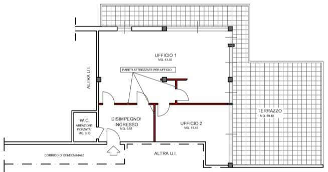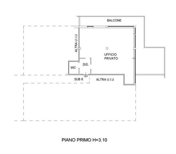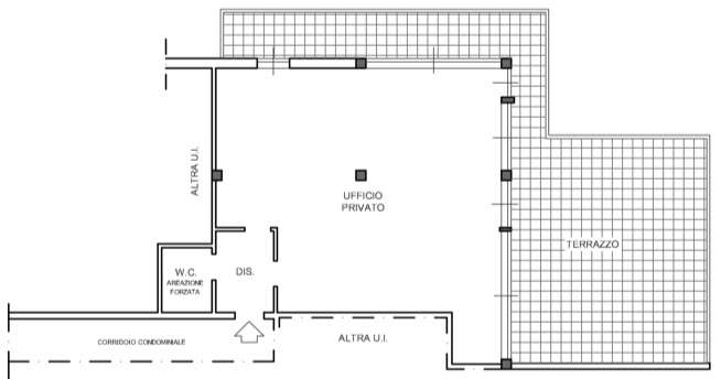 diritti di piena proprietà di un immobile ad uso ufficio al primo piano, composto da un unicoambiente e un w.c. ed è stato suddiviso in un ingresso e due vani adibiti ad ufficio mediantel’installazione di pareti attrezzate ed ha una superficie lorda di 144 mq – di cui 81 mq l’ufficio e63 mq il balcone terrazzo