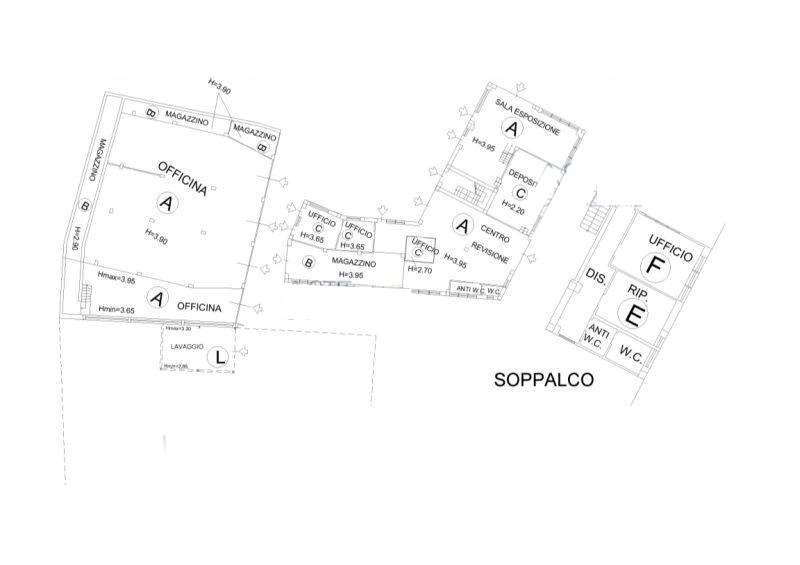 Locali reali: Area espositiva, ambienti di servizio (uffici, centro revisioni, magazzini, deposito), soppalco (uffici e servizi), e ampia area officina con tre magazzini annessi.