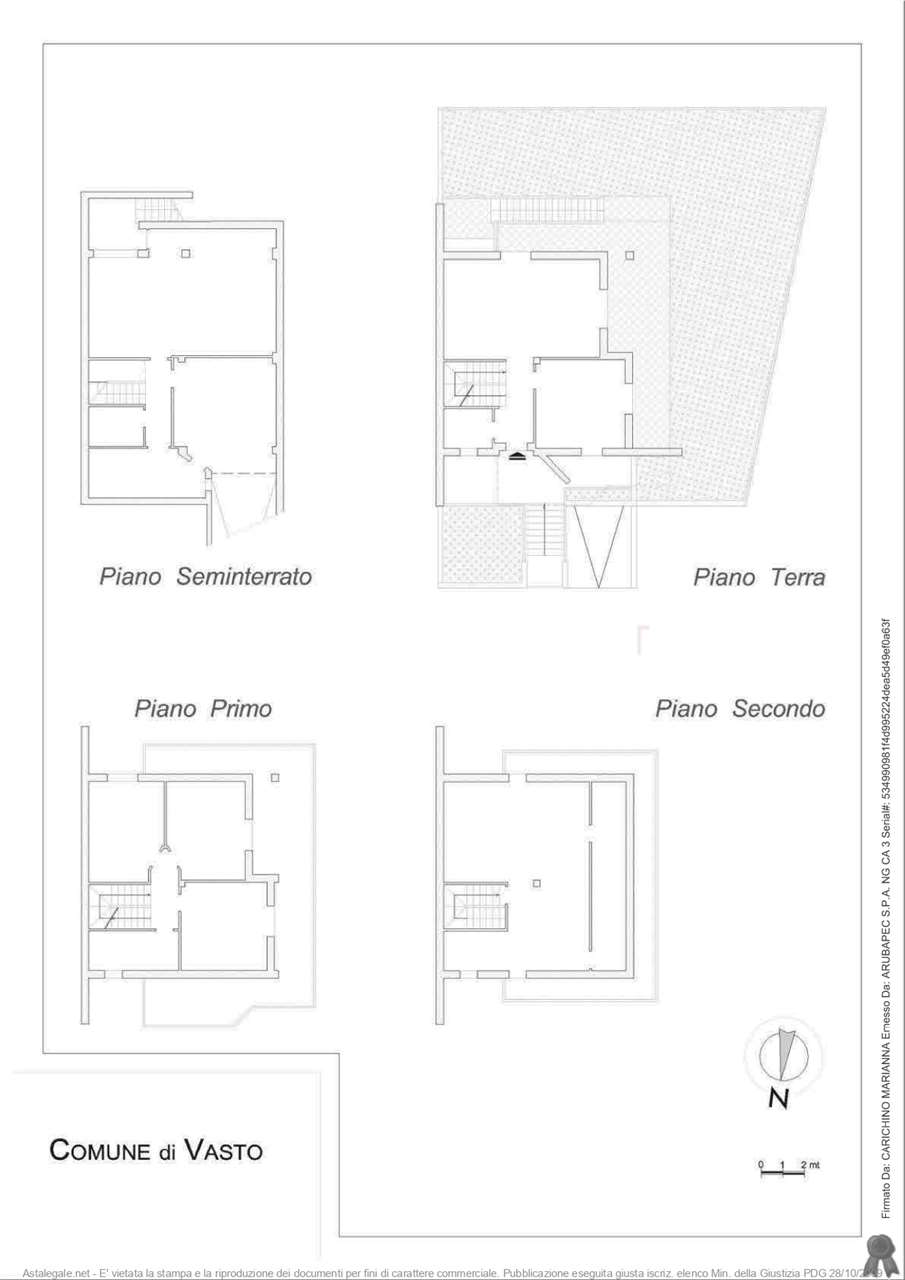 L’immobile è composto da quattro livelli collegati internamente da corpo-scala. Piano terra: ingresso, soggiorno, cucina, bagno giorno. Altezza piano mt 2,70. Esterni: superficie pavimentata, portico e giardino. Piano seminterrato: disimpegno, WC, cantina, ripostiglio. Altezza piano mt 2,50. Esterni: piccolo atrio e scalinata. Piano primo: disimpegno, bagno notte, tre camere da letto. Altezza piano mt 2,70. Esterni: balcone. Piano secondo: sottotetto. Altezza variabile mt 3.00 – 1.16 h media mt 2,08. Esterni pensilina calpestabile."